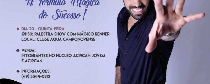 A Palestra Show – A Fórmula Mágica do Sucesso, com Mágico Renner será um evento aberto ao público local e os ingressos são limitados. Para adquirir os ingressos no valor de R$ 10,00 poderá ser através dos nucleados Acircan Jovem ou na Sede da Entidade (Acircan).