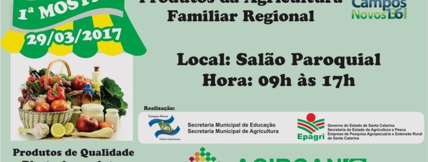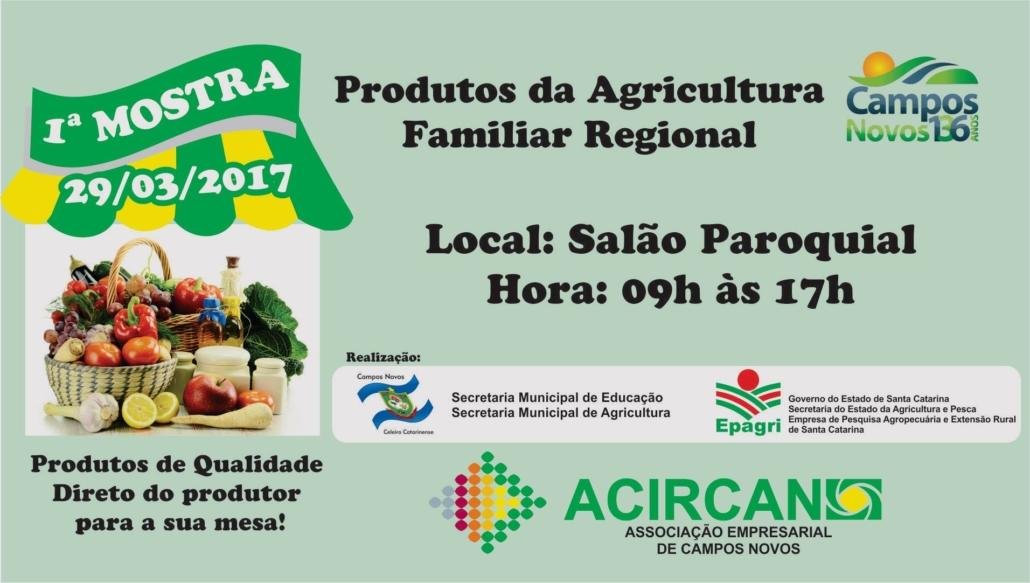 O Salão Paroquial de Campos Novos está sendo organizado para receber a 1ª Edição da Mostra de Produtos da Agricultura Familiar Rural. O evento acontecerá no dia 29 de março (quarta-feira), no período das 09h às 17h sem fechar ao meio dia.