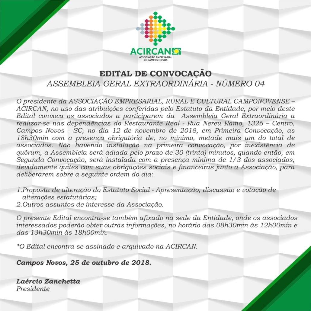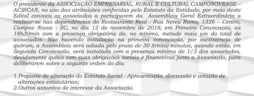 O presidente da ASSOCIAÇÃO EMPRESARIAL, RURAL E CULTURAL CAMPONOVENSE – ACIRCAN, no uso das atribuições conferidas pelo Estatuto da Entidade, por meio deste Edital convoca os associados a participarem da Assembleia Geral Extraordinária a realizar-se nas dependências do Restaurante Real – Rua Nereu Ramo, 1326 – Centro, Campos Novos – SC, no dia 12 de novembro de 2018, em Primeira Convocação, as 18h30min com a presença obrigatória de, no mínimo, metade mais um do total de associados. Não havendo instalação na primeira convocação, por inexistência de quórum, a Assembleia será adiada pelo prazo de 30 (trinta) minutos, quando então, em Segunda Convocação, será instalada com a presença mínima de 1/3 dos associados, devidamente quites com suas obrigações sociais e financeiras junto a Associação, para deliberarem sobre a seguinte ordem do dia: