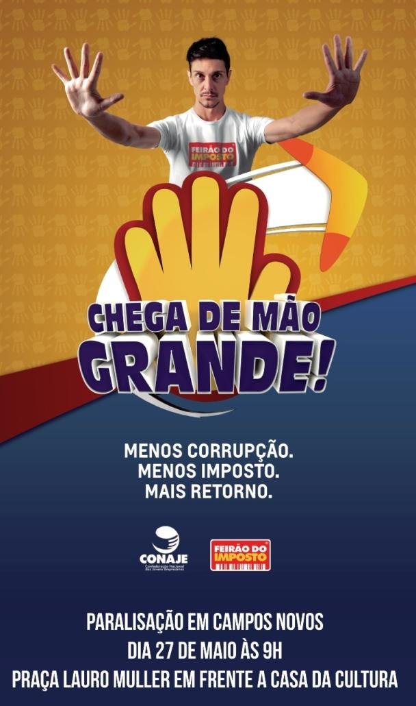 O coordenador do Feirão do Imposto em Campos Novos, Fernando Semin, ressaltou ainda que a mobilização acontecerá no período de meia hora, ou seja, das 09h às 09h30 e o Núcleo dos Jovens Empreendedores conclama aos empresários para aderir à campanha e faz um apelo para que fechem as portas nessa meia hora como forma de protesto. ‘Venha fazer parte da mobilização, para mostrar à população que estamos indignados com o que está acontecendo no país” convidou Fernando Semin.