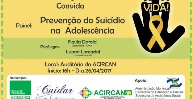 O Painel “Prevenção do Suicídio na Adolescência”, acontecerá na próxima quarta-feira (26/04), no auditório da ACIRCAN com início às 16h. Além dos profissionais de Campos Novos devem estar presentes representantes dos municípios da AMPLASC. O evento é uma realização do Núcleo das Psicólogas da ACIRCAN com o apoio da Secretaria Municipal de Educação e Cultura, Secretaria de Assistência Social, Secretaria de Saúde, e Centro de Psicoterapias “Cuidar”.