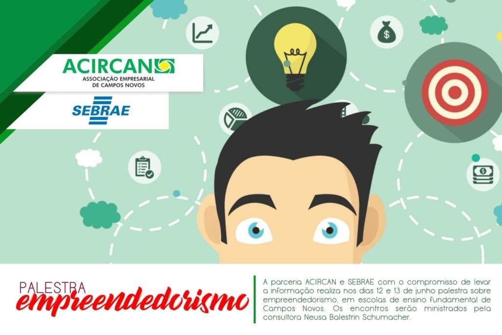 A parceria ACIRCAN e SEBRAE com o compromisso de levar a informação realiza nos dias 12 e 13 de junho palestra sobre empreendedorismo, em escolas de ensino fundamental de Campos Novos. Os encontros serão ministrados pela consultora Neusa Balestrin Schumacher.